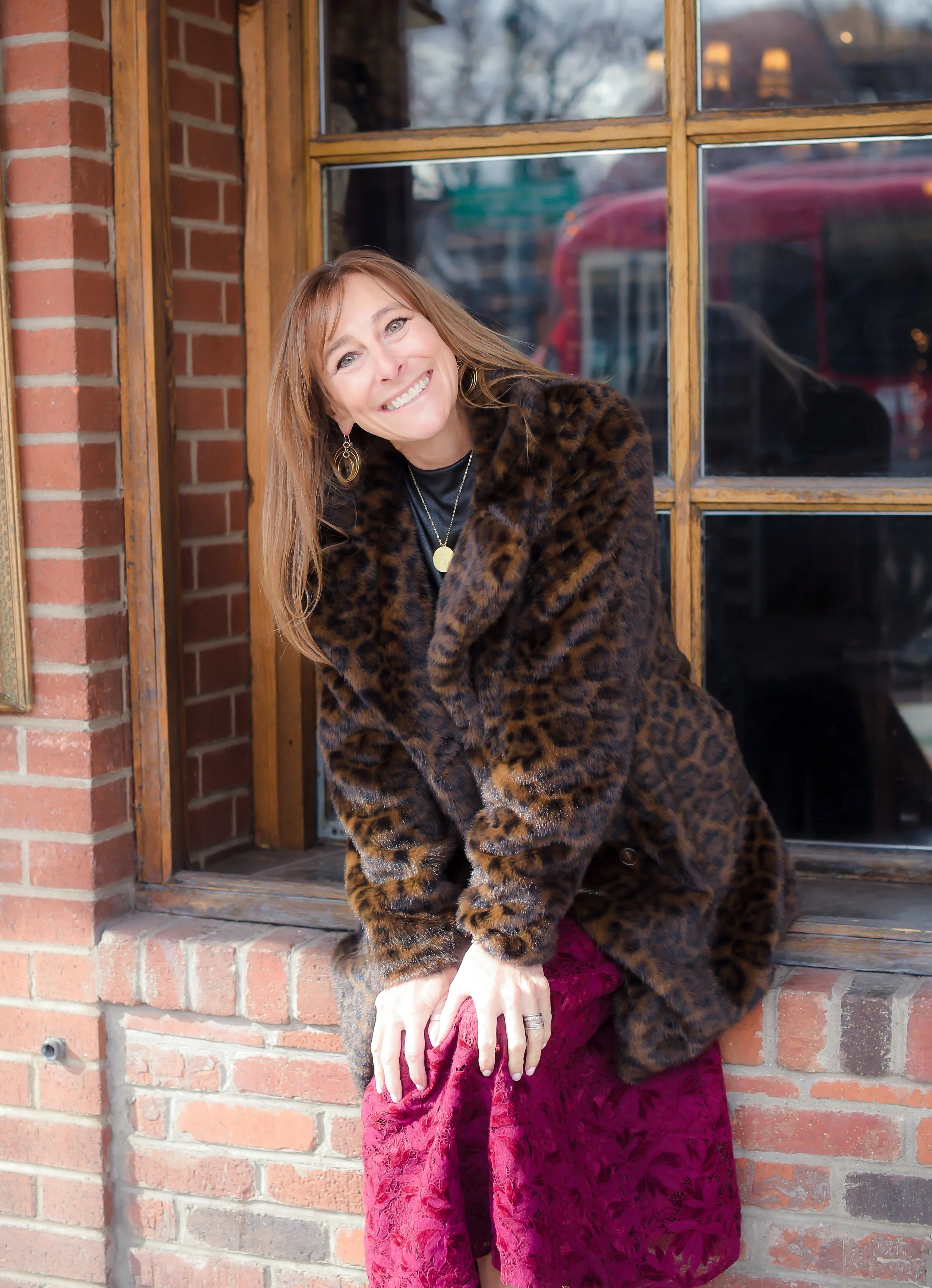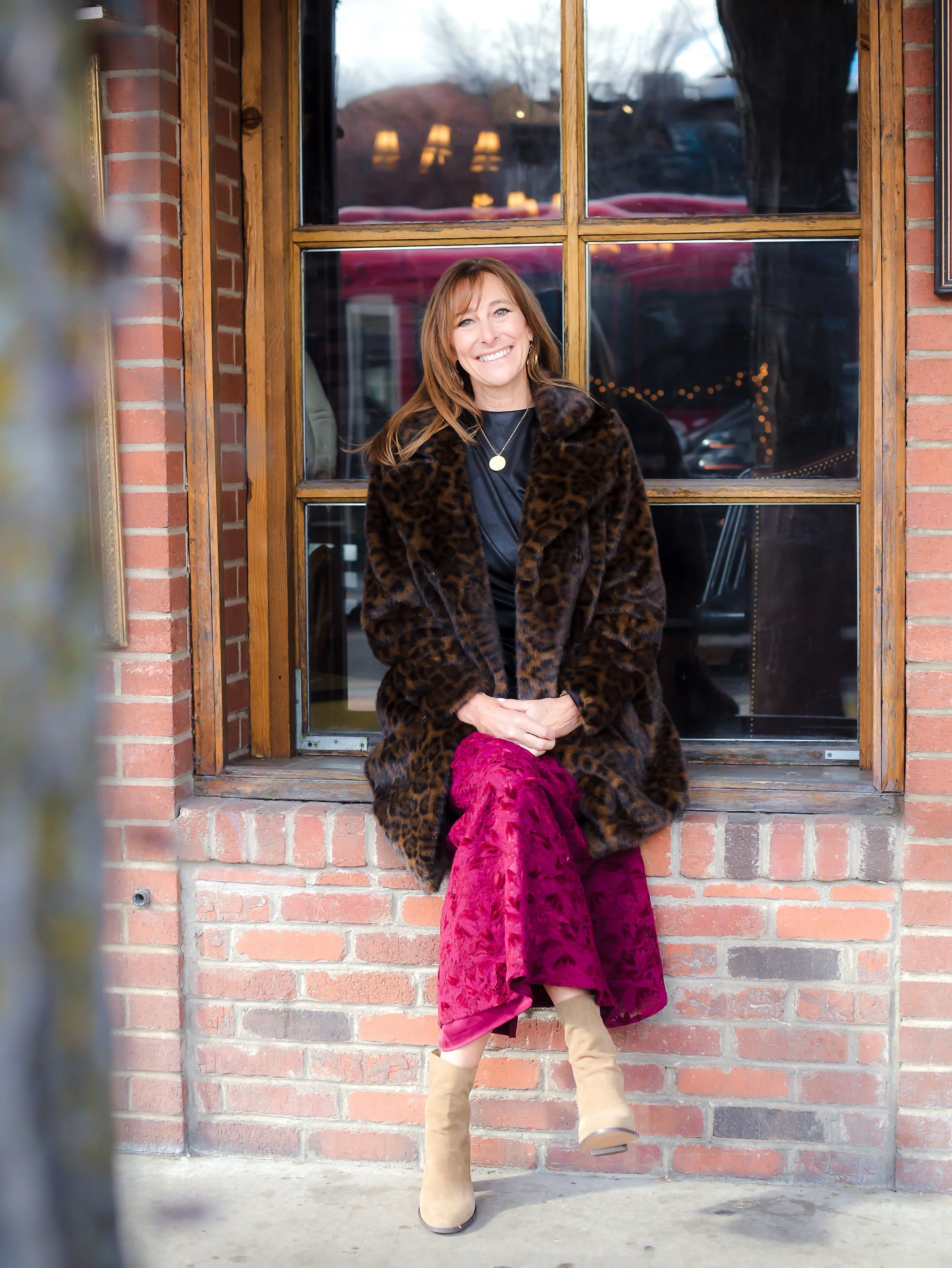 For the holiday partygoer who loves a standout look, this rich mix of color and texture is a seasonal dream. The plush faux-fur coat instantly says holiday luxe, while the deep red skirt adds a bold pop of color that feels joyful and fresh. Paired with neutral suede boots, this outfit is equal parts cozy and glamorous — a perfect choice for the outdoor holiday market, dinner at Eolus, or any event where you want to stay warm without sacrificing style.