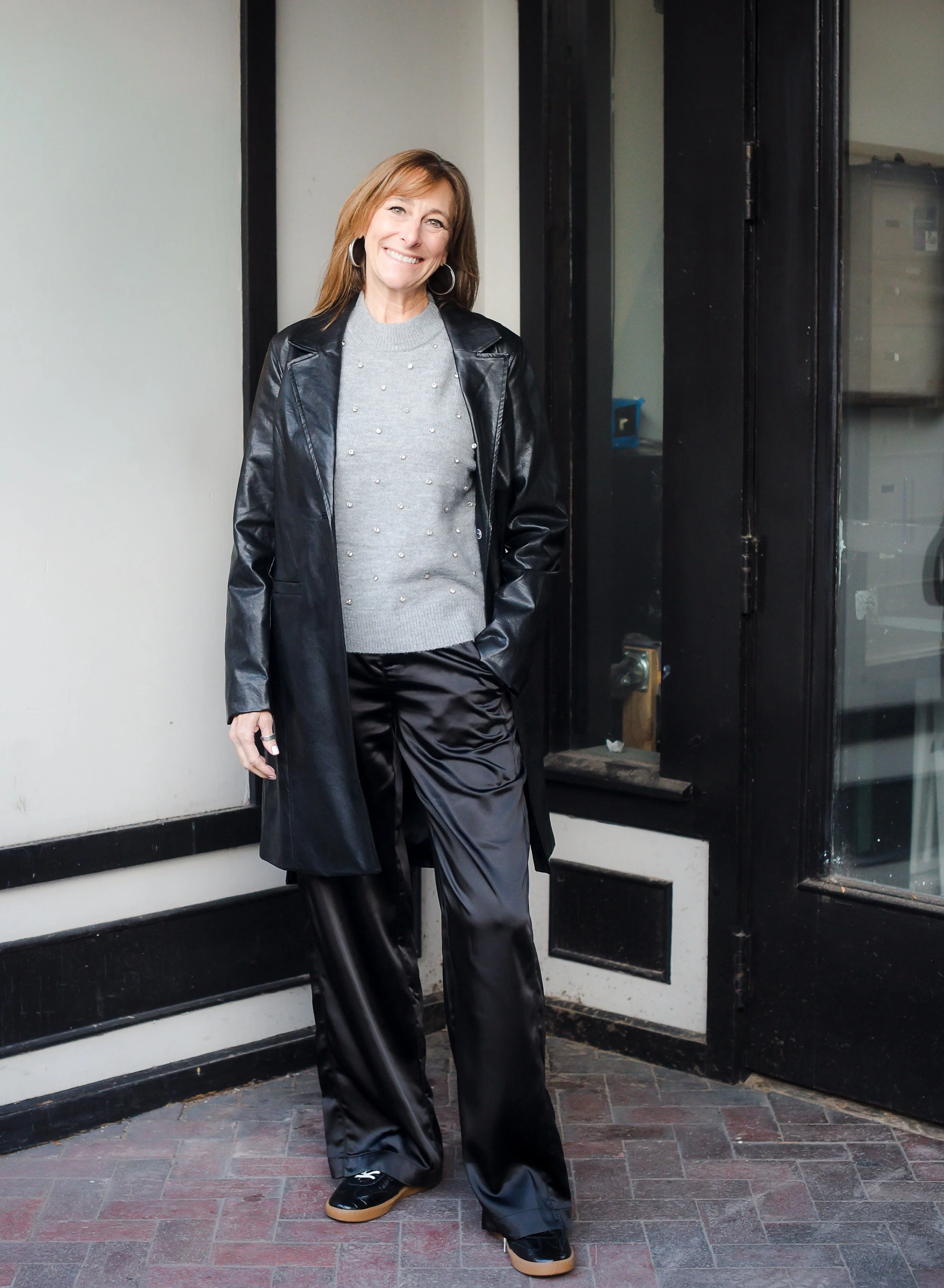 If your holiday plans lean more modern — office gatherings, casual cocktails, or a night out with friends — this look is all about understated glamour. The satin pants bring a subtle shine that instantly feels festive, while the crystal-embellished sweater adds just the right amount of holiday sparkle. Top it with a sleek faux-leather jacket, and you’ve got a comfortable yet elevated outfit that transitions seamlessly from day to night. This is the perfect pick for the person who loves looking polished without feeling overdone.